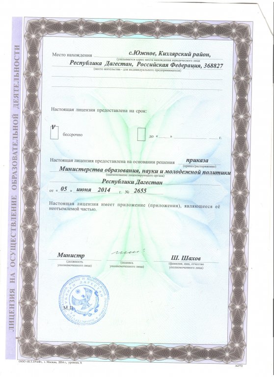 | Адрес местонахождения образовательной организации* | 368827, Республика Дагестан, Кизлярский район, с. Южное, ул. Школьная , д.7 |