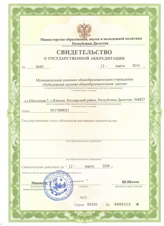 | Полное наименование образовательной организации* | Муниципальное казенное образовательное учреждение "Победовская средняя общеобразовательная школа им. Ибрагимхалилова Шамиля Ибрагимхалиловича" |